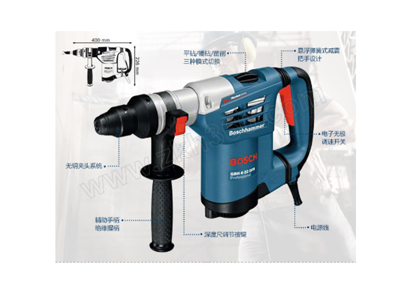 ·适用于削凿与钻孔作业,并可与岩心切割机配合使用,应用范围广泛 ·钻孔速率比博世同级产品中的其它工具高出多达30%(25毫米直径) ·得益于博世振动控制系统的低振动水平(仅12米/秒²)可降低工作疲劳度