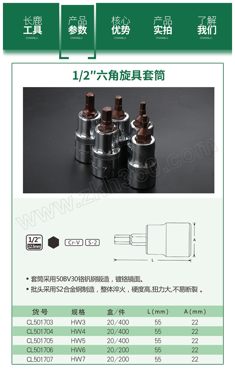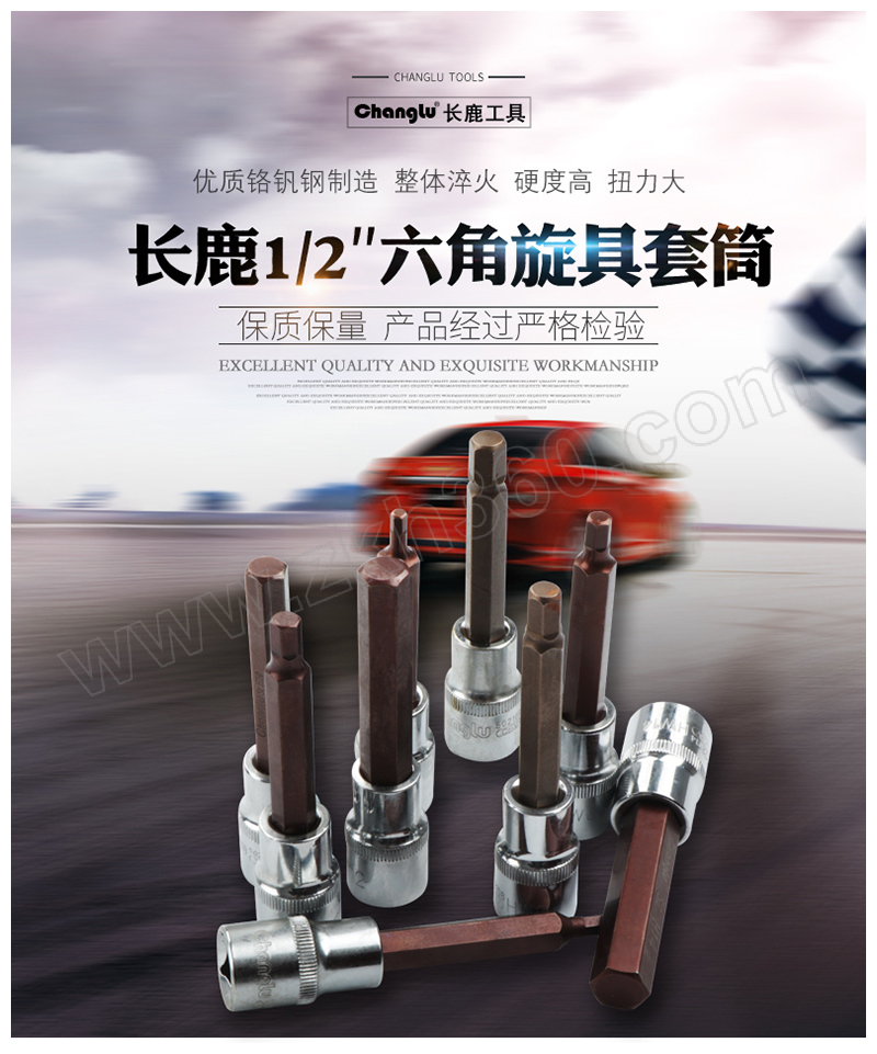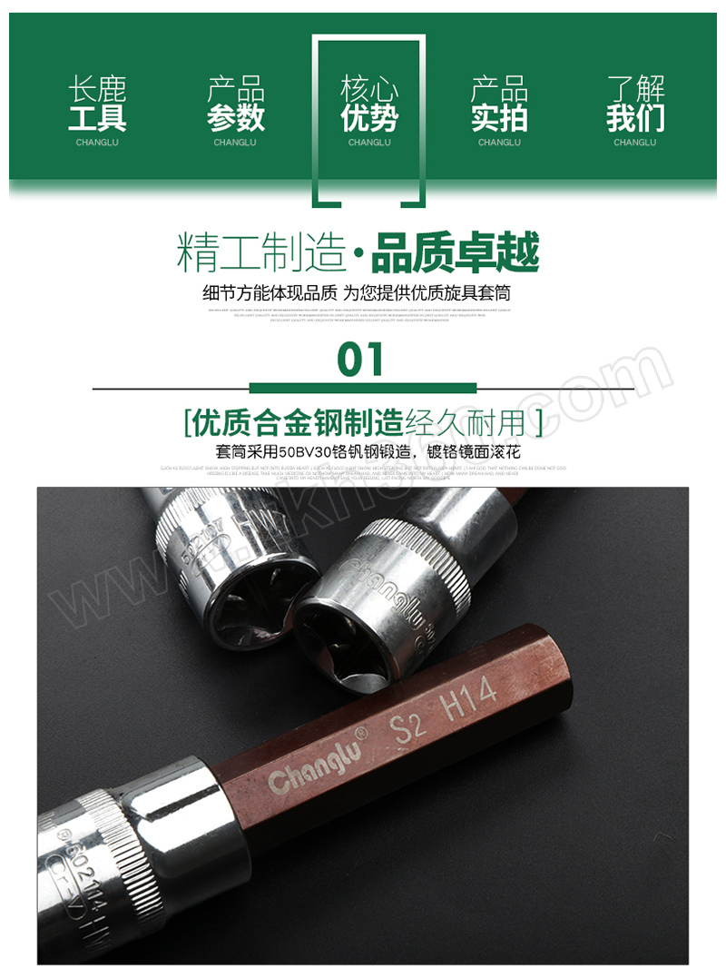 ·符合DIN2936标准制造要求 ·套筒采用50BV30铬钒钢锻造,镀铬镜面 ·批头采用S2合金钢制造,整体淬火,硬度高,扭力大,不易断裂