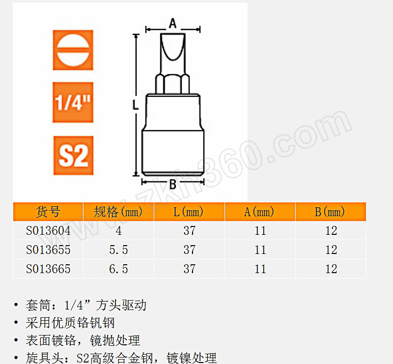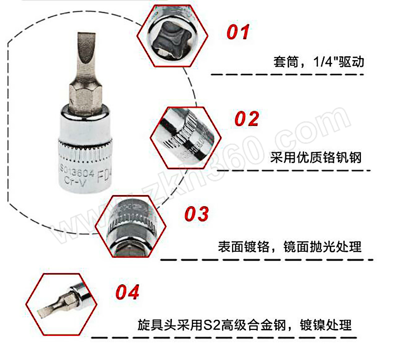 ·套筒:1/2"方头驱动,采用优质铬钒钢,表面镀铬,镜面抛光处理。 ·旋具头:S2高级合金钢,镀镍处理。
