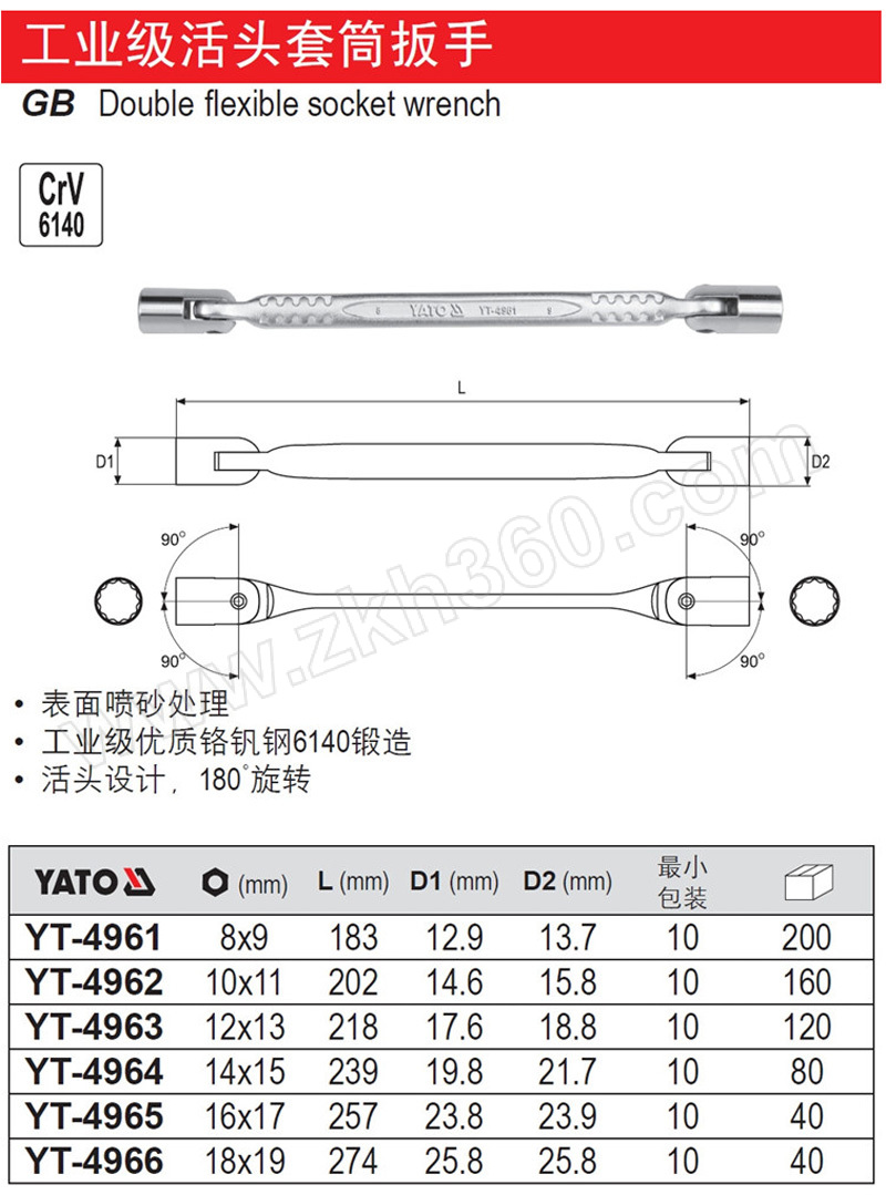 ·表面喷砂处理。 ·工业级优质铬钒钢6140锻造。 ·活头设计,180°旋转。