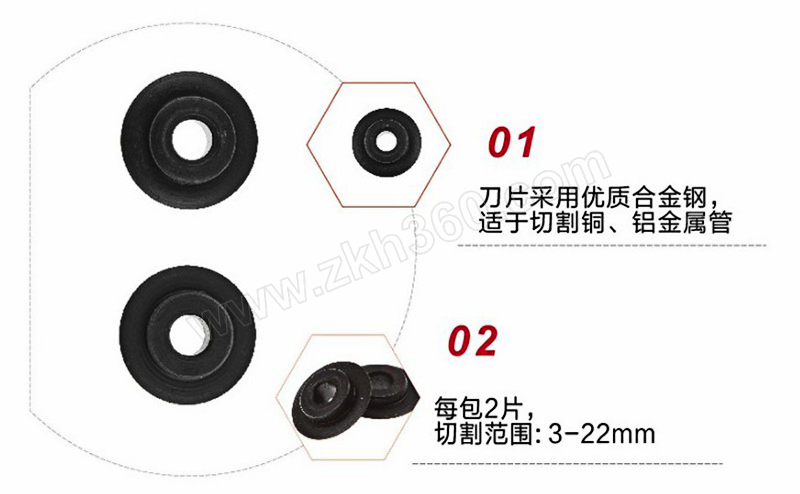 ·刀片采用优质合金钢,适于切割铜、铝金属管。 ·S100101每包2片,切割范围:3~22mm。 ·S100102每包2片,切割范围:6~45mm,14~63mm。