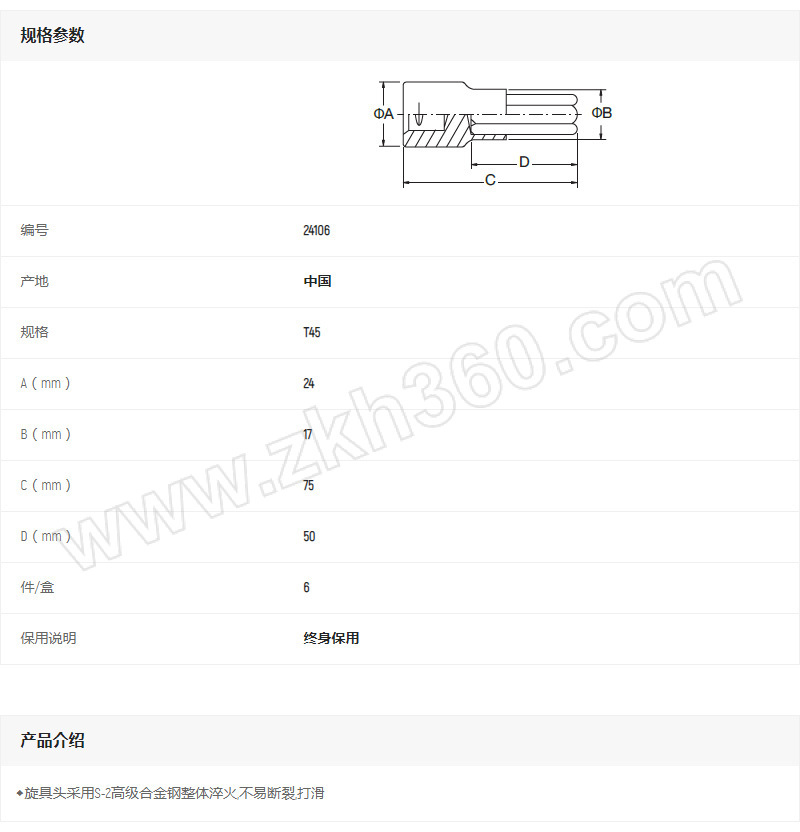 | 材质 | 套筒铬钒钢 旋具头S2 |