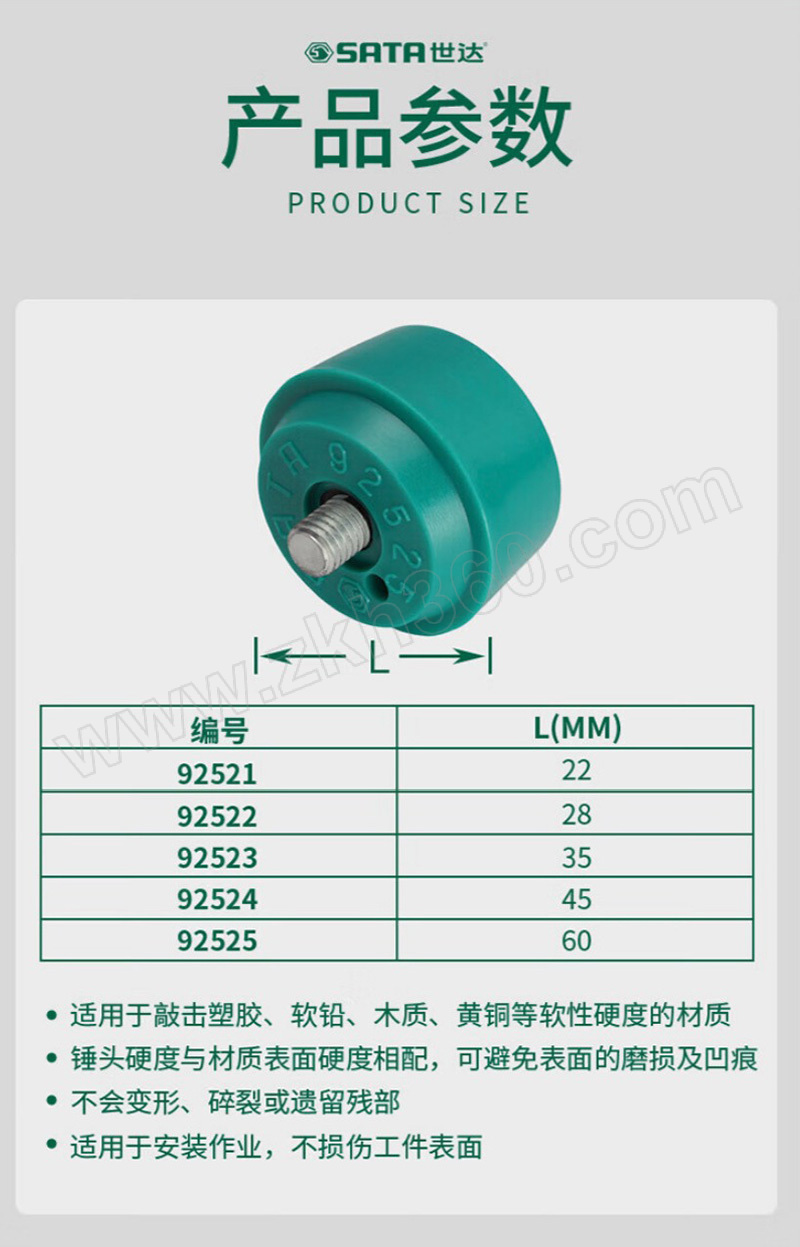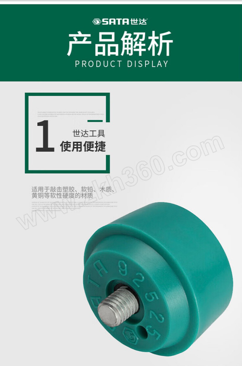 ·适用于敲击塑胶、软铅、木质。黄铜等软性硬度的材料。 ·锤头硬度与材质表面硬度相配,可完全避免表面的磨损及凹痕。 ·不会变形、破碎或遗留任何残部。 ·适用于安装作业,不损伤工件表面。