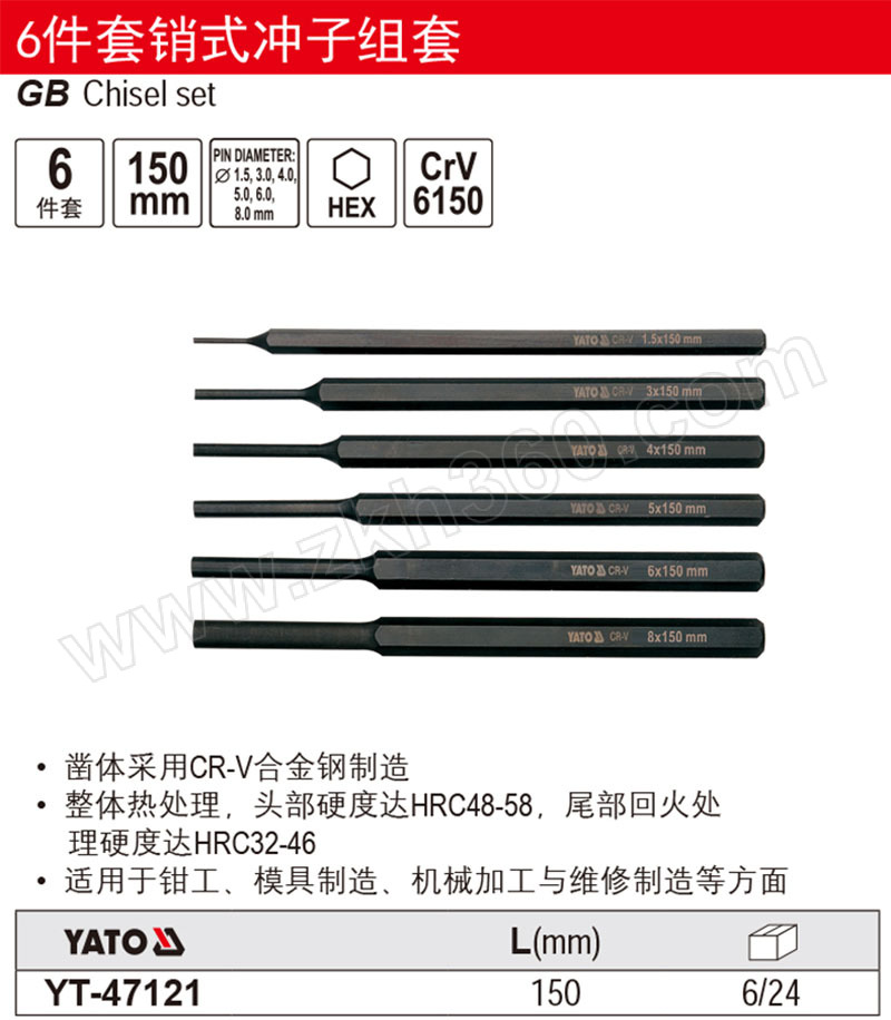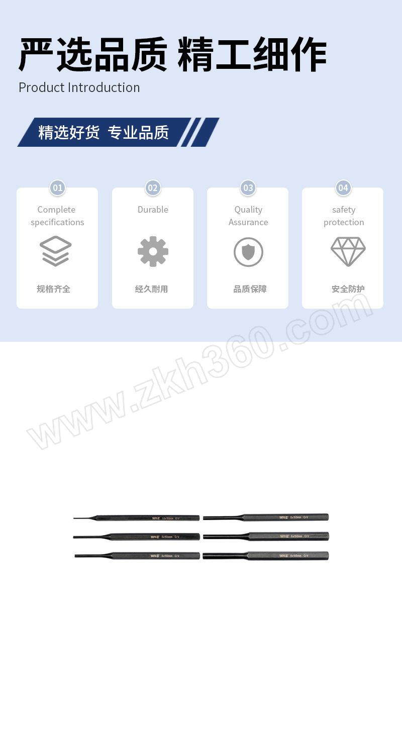 ·凿体采用铬钒钢制造。 ·整体热处理,头部洛氏硬度达53~60HRC,尾部回火处理洛氏硬度达32~46HRC。 ·适用于建筑、装潢、石材加工及设备维修等行业。