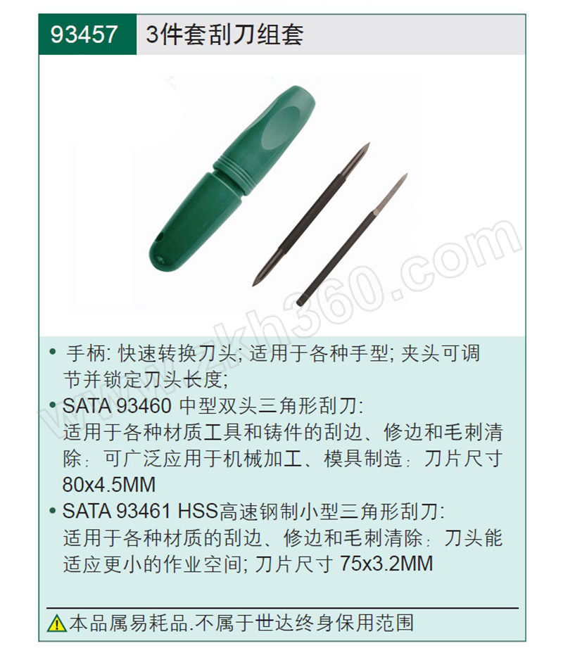 ·手柄:快速转换刀头;适用于各种手型;夹头可调节并锁定刀头长度。 ·SATA-93460中型双头三角形刮刀:适用于各种材质工具和铸件的刮边、修边和毛刺清除;可广泛应用于机械加工、模具制造;刃部洛氏硬度可达58~60HRC;刀片尺寸80×4。5mm。 ·SATA-93461-HSS高速钢制小型三角形刮刀:适用于各种材质的刮边、修边和毛刺清除;刃部洛氏硬度可达62~64HRC;刀头能适应更小的作业空间;刀片尺寸75×3。2mm。
