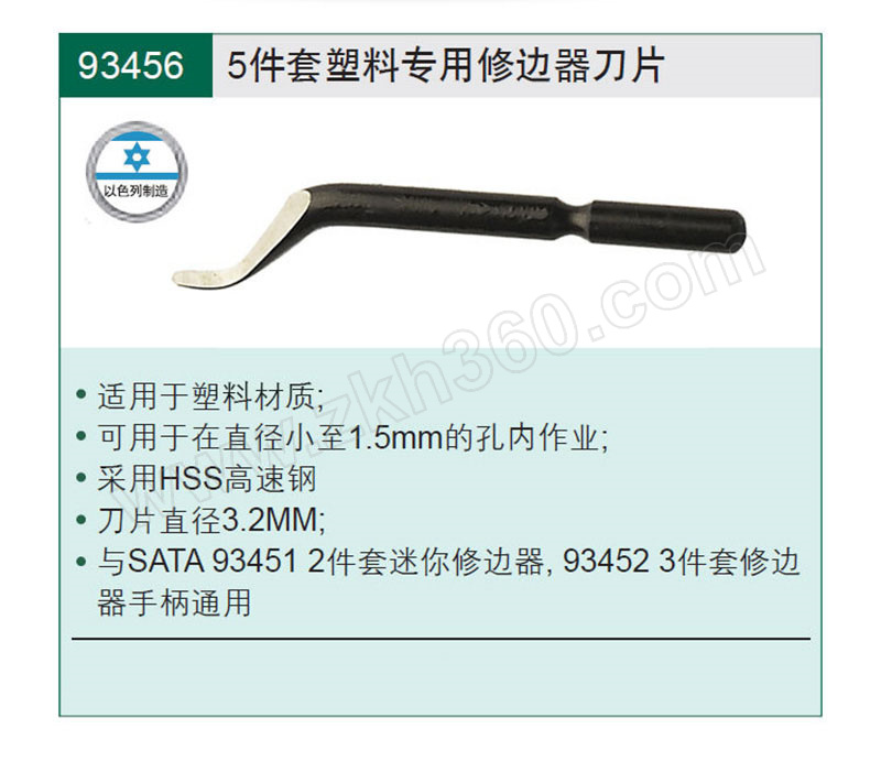 ·适用于塑料材质。 ·可用于在直径小至1。5mm的孔内作业。 ·采用HSS高速钢,刃部洛氏硬度可达62~64HRC。 ·刀体直径3。2mm。 ·配合SATA-93451和SATA-93452手柄使用。