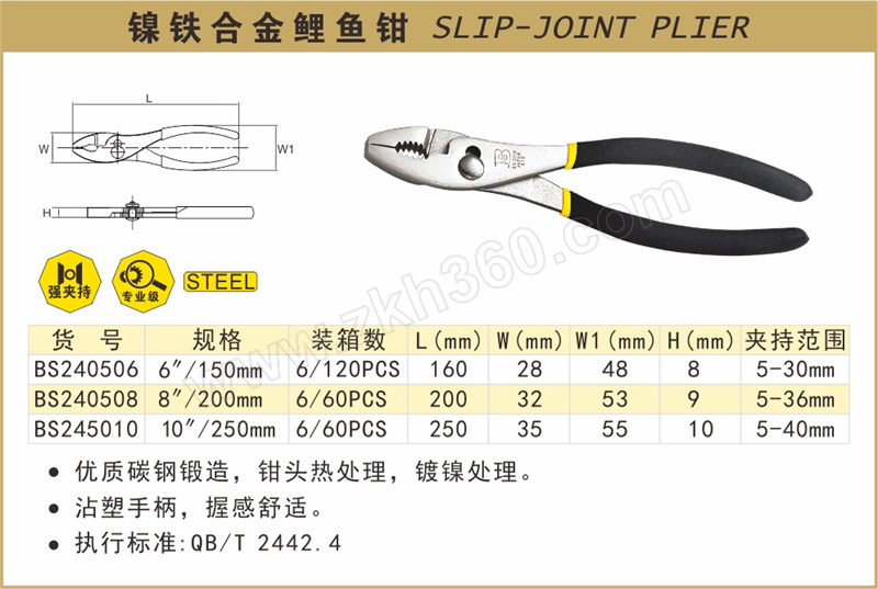·优质45#高碳钢锻造精工锻造,钳头热处理,硬度HRC45-48,镀镍处理,两次沾塑手柄