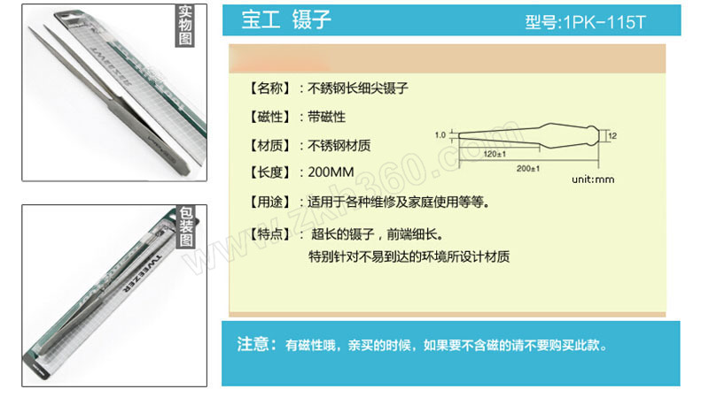 ·本体为不锈钢材质打造,无磁性。 ·细镊子头与轻巧设计,适用于各种电子业、半导体业、饰品珠宝、钟表眼镜加工维修使用。