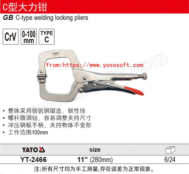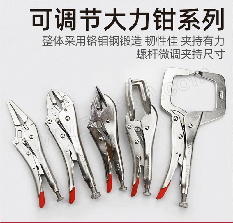 ·整体采用40铬钒钢锻造,韧性佳。 ·螺杆微调钮,容易调整佳夹持尺寸。 ·冲压钢板手柄,夹持物体不变形。 ·工作范围100mm。