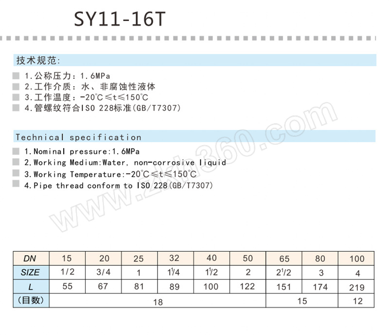 ·工称压力:1.6PMa ·工作介质:自来水 ·工作温度:0℃<t≤150℃ ·管螺纹符合ISO 228标准