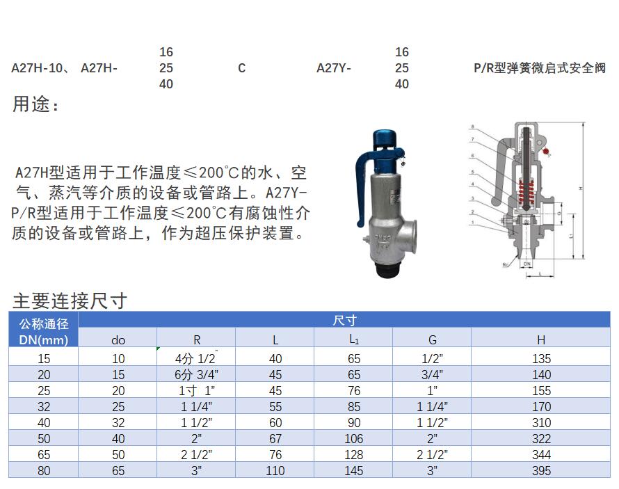 A27H型适用于工作温度≤200℃的水、空气、蒸气等介质的设备或管路上。