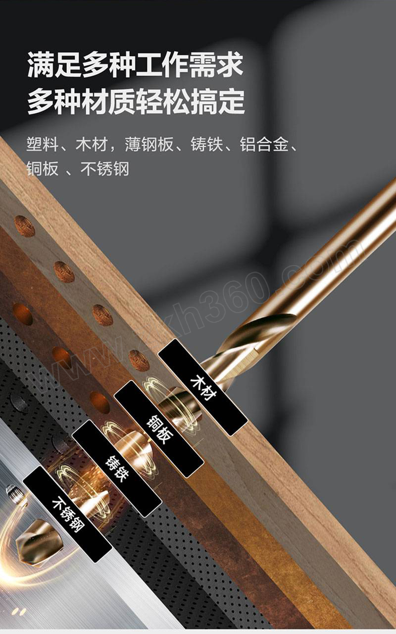 ·采用M35高速钢,含钴5%,整体热处理,磨制工艺,表面烤黄处理,·高硬度、耐磨度与韧性,使用寿命长 ·顶部形状为分割点135°,自定心功能,钻孔准确不打滑·沟槽研磨成型,排屑顺畅,效率高·适用不锈钢板、磨具钢等高硬度板材打孔