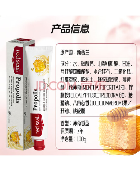 红印(Red seal)蜂胶牙膏100g 无氟牙膏防蛀固齿清洁口腔孕妇可用 抑菌清新口气