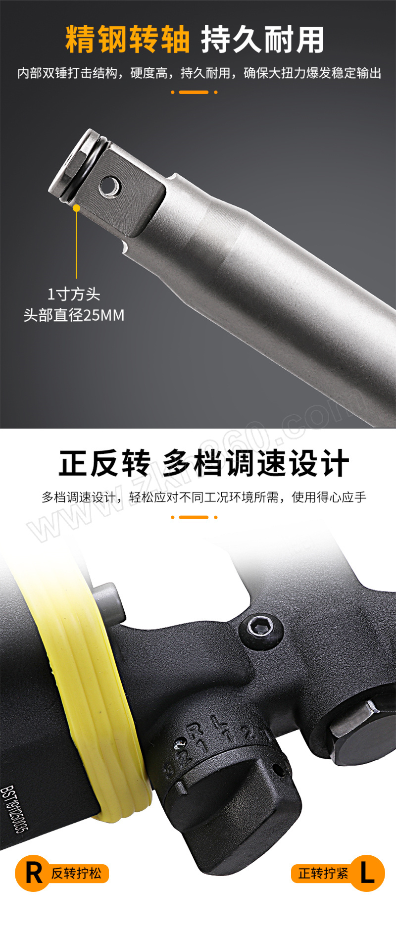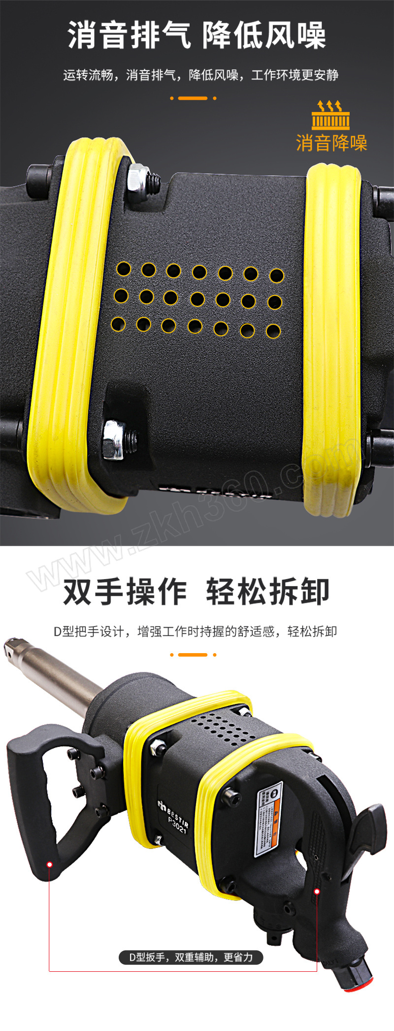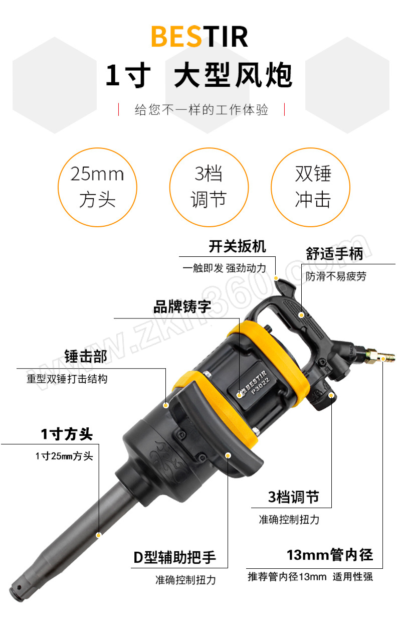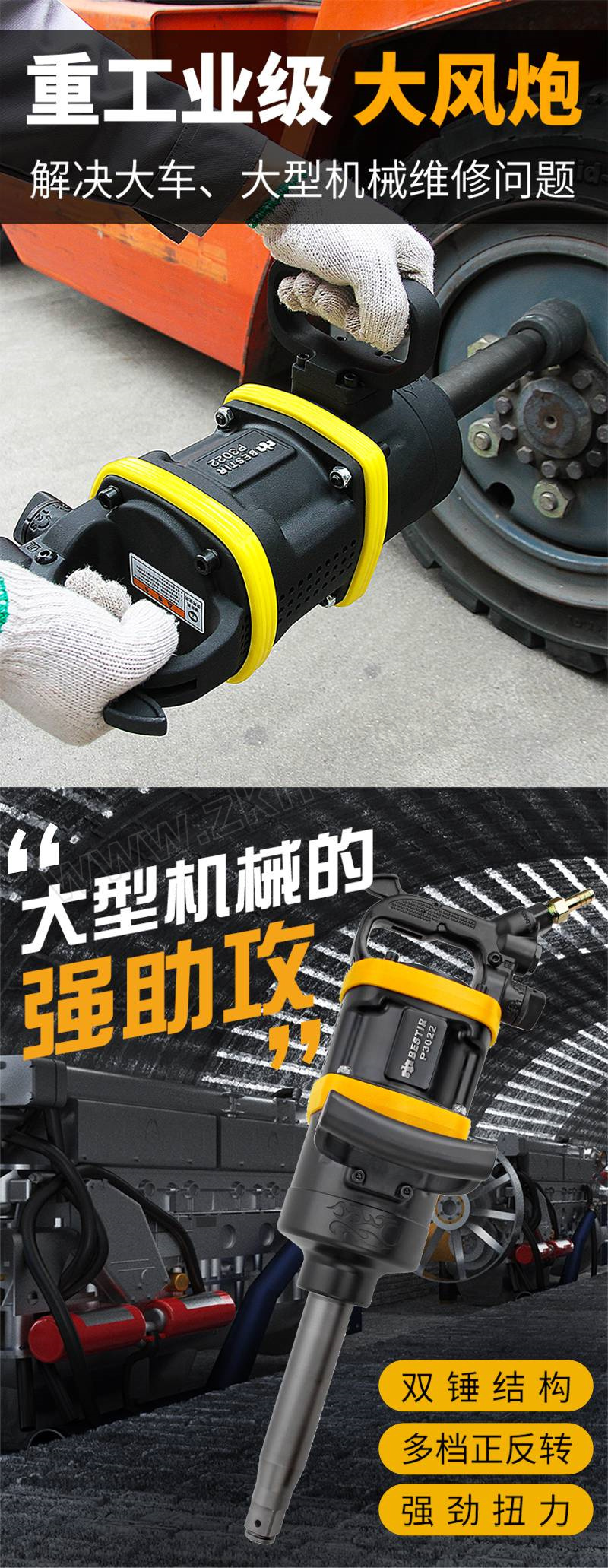 ·传动件采用高镍合金钢制造,经数控精密加工,调质热处理,耐磨性好 ·重型打击结构,扭矩输出强劲,进口双轴承设计,使用寿命长 ·人体工程学设计的握把,可提高操作者的舒适度 ·适用于重型机械螺栓拆装使用