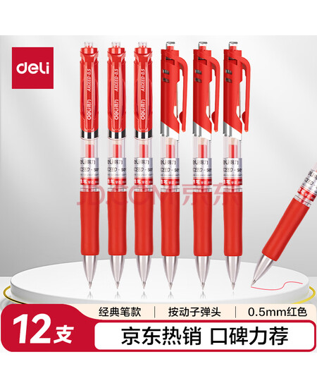 得力(deli)S01按动中性笔签字笔 0.5mm子弹头经典办公按动笔水笔 红色 12支/盒