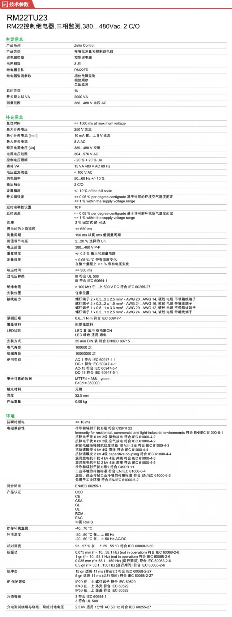 施耐德电气 三相缺相、相序、欠压监测继电器 380…480VAC RM22TU23