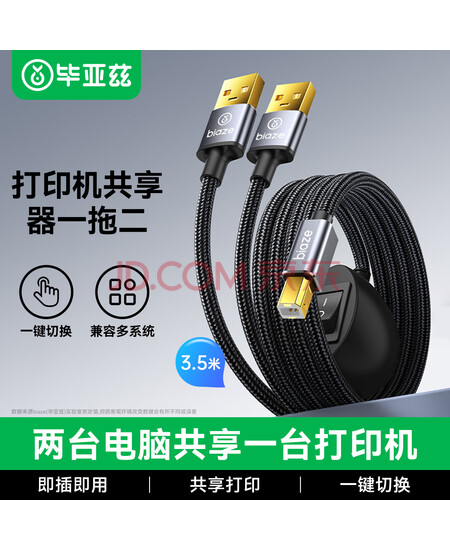 毕亚兹 打印机共享器一拖二三分线数据两台电脑共用鼠标键盘办公连接线 适用惠普佳能联想三星 3.5米