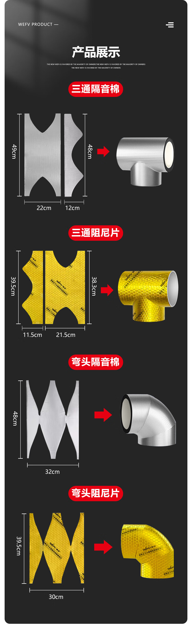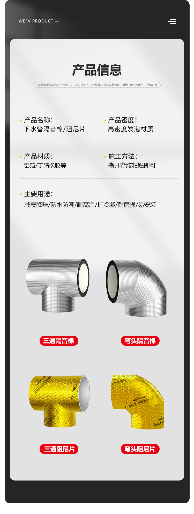 维芙WEFV下水管阻尼片110管弯头专用管道隔音厨房阳台卫生间下水管