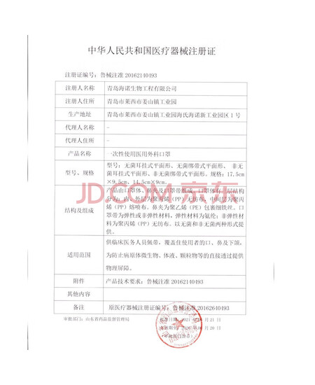 | 医疗器械注册证编号或者备案凭证编号 | 鲁械注准20162140493 |