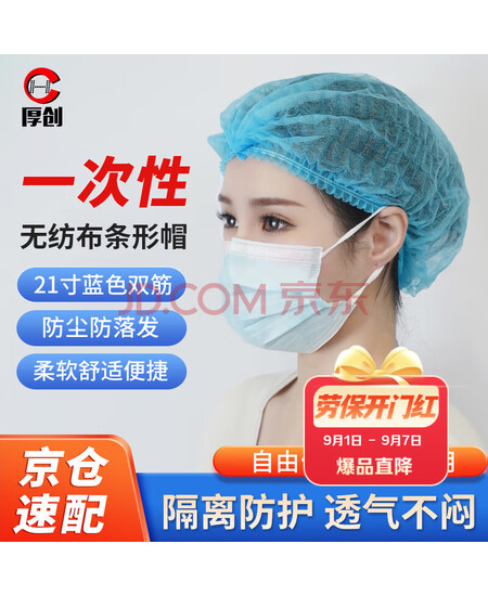 厚创 一次性防尘帽【京配次日达】 无纺布条形帽防尘防落发帽子 21寸蓝色双筋100只