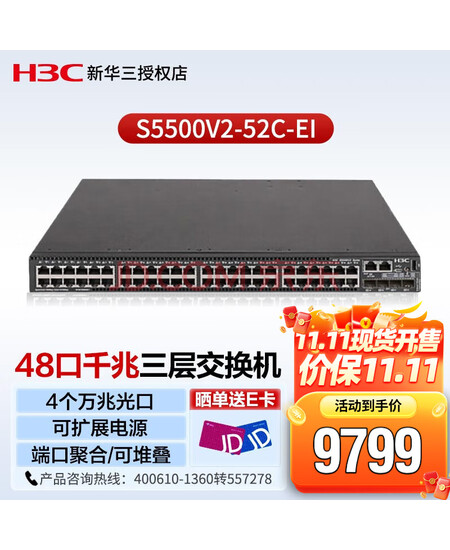 新华三(H3C)S5500V2-52C-EI 企业级48口千兆三层核心网管交换机 4个万兆光口 支持端口聚合 VLAN 堆叠 组播