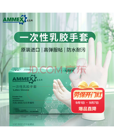 爱马斯一次性乳胶手套标准型 防水耐污 餐饮清洁100只 米黄色 大号L码