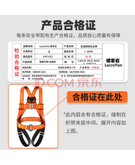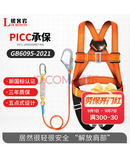 螺客岩五点式安全带 高空作业安全绳 全身式防坠落国标 单大钩缓冲包1.8米【京仓闪送】