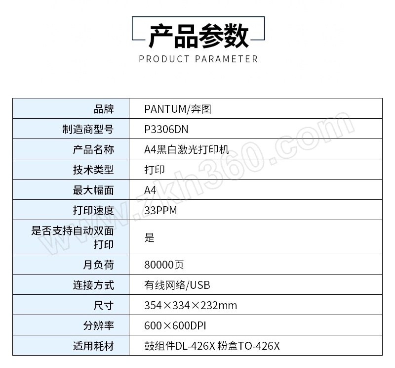 | 核心规格 | 适用鼓组件DL-426X 粉盒TO-426X 有线/USB 自动双面打印 |