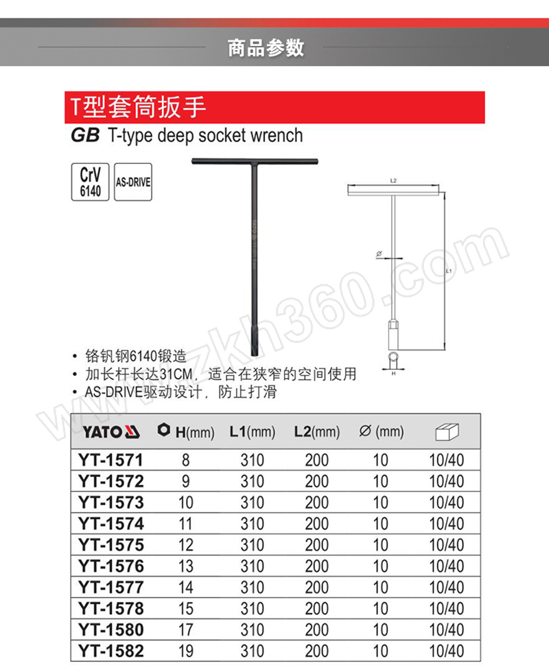 ·工业级优质铬钒钢6140锻造。 ·加长杆长达31cm,合适在狭窄的空间使用。 ·AS-DRIVE驱动设计,防止打滑。