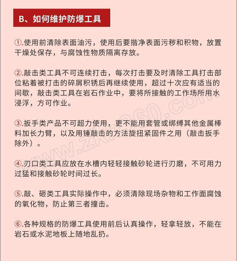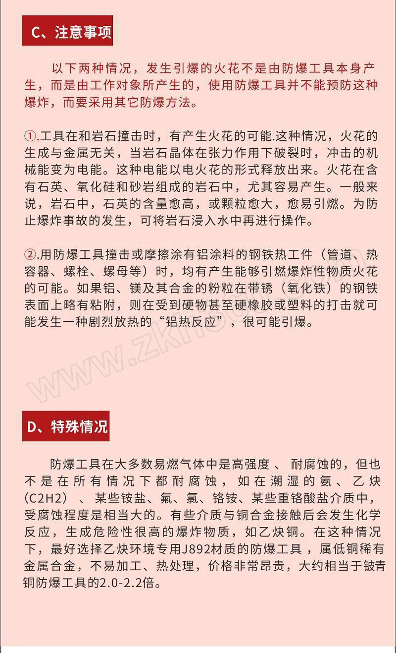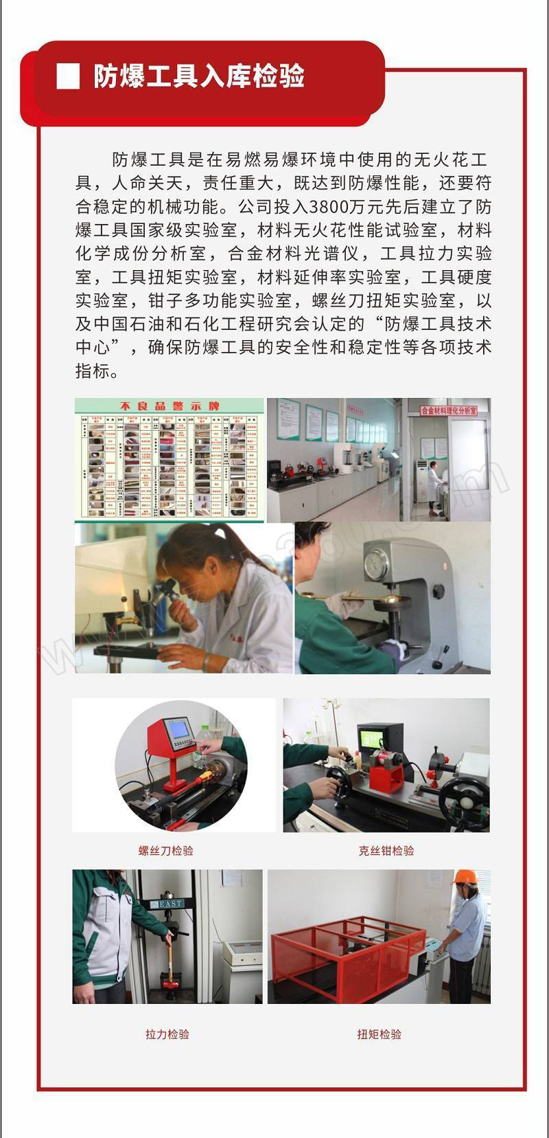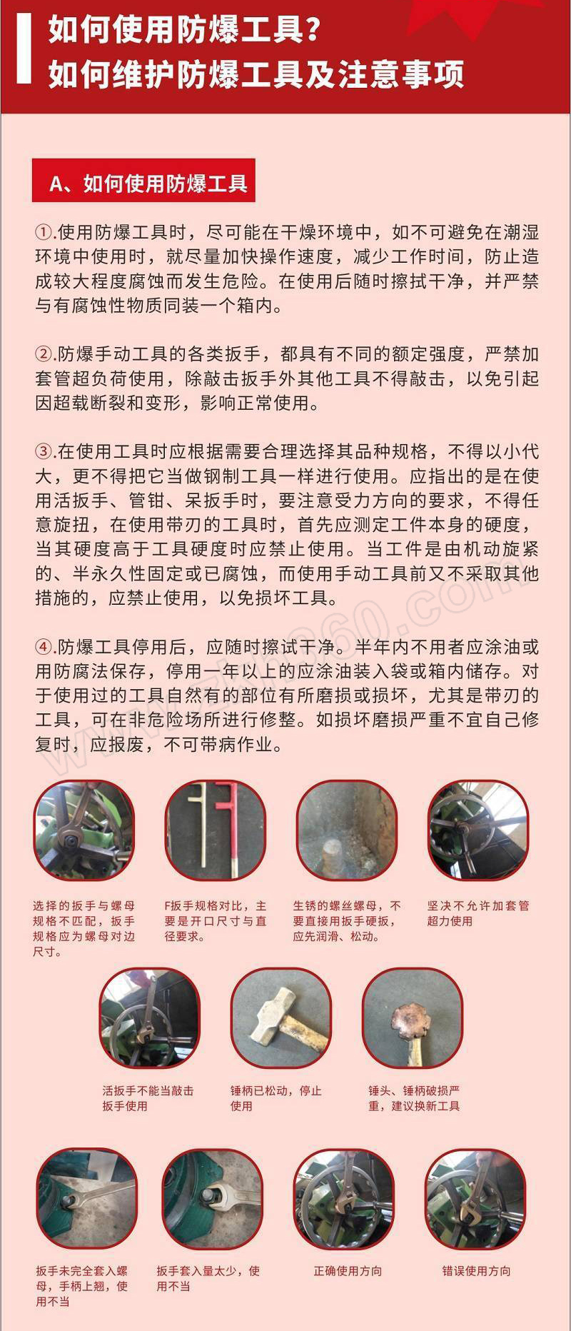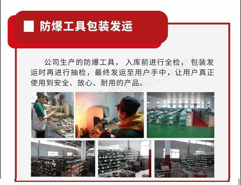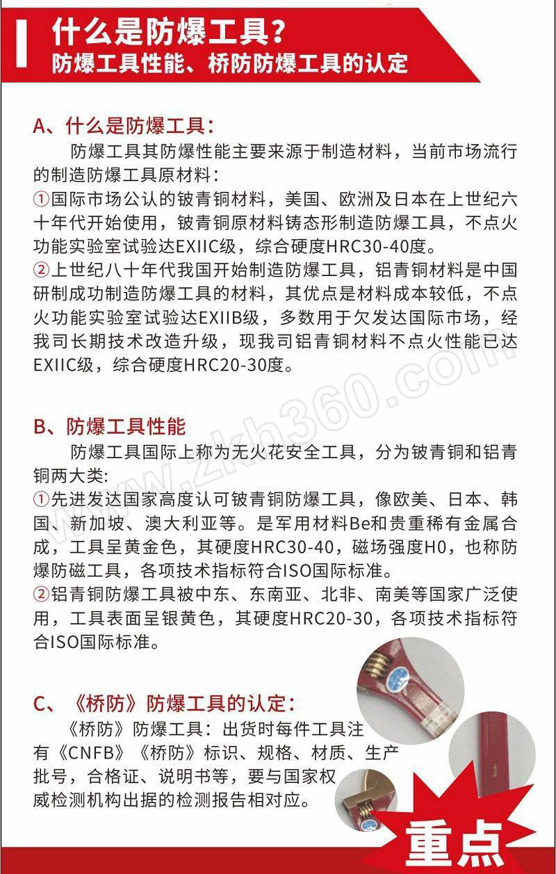 ·强度高,结构轻巧,造型美观,经久耐用。 ·能有效地防止工具与工件间相互摩擦、撞击时产生的可燃性爆炸。 ·适用于石油、化工、矿山等有危险作业的行业,是安全生产的工具。