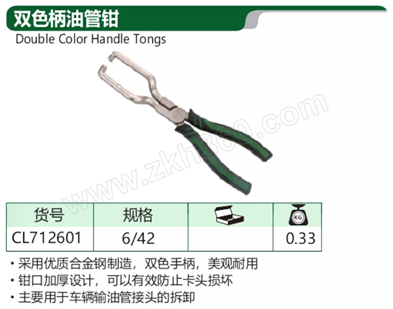 ·采用优质合金钢制造,双色手柄,美观耐用 ·钳口加厚设计,可以有效防止卡头损坏 ·主要用于车辆输油管接头的拆卸