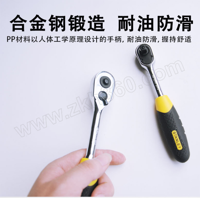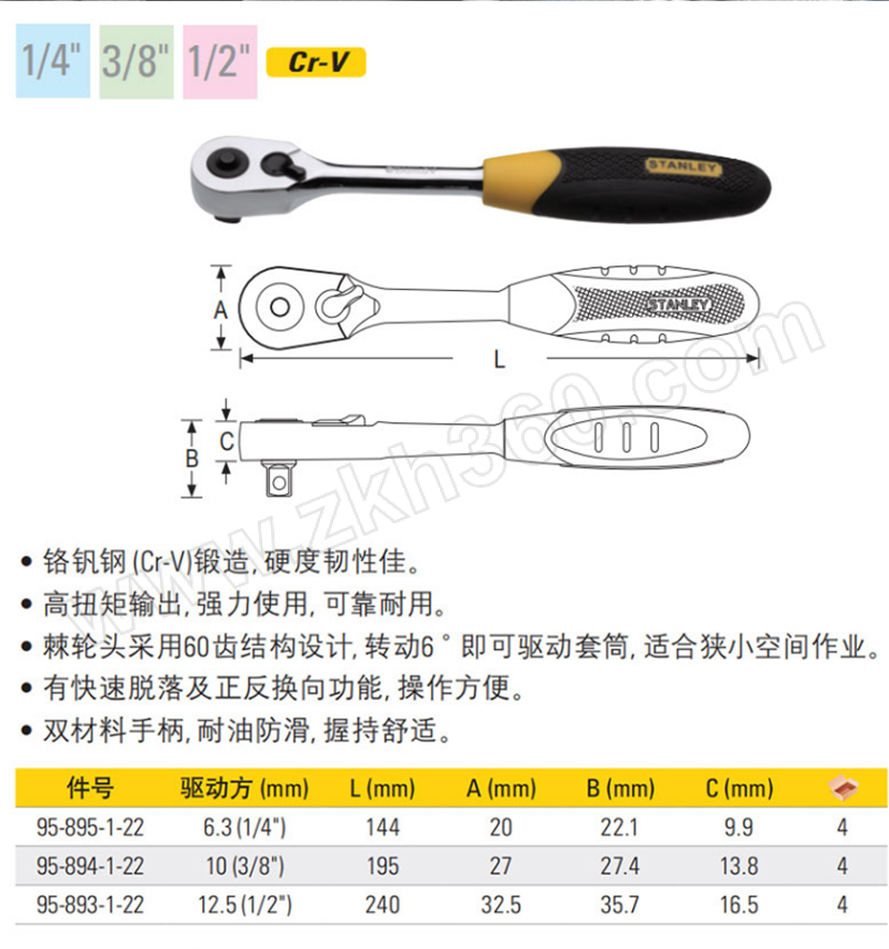 ·铬钒钢(Cr-V)锻造,硬度韧性佳。 ·高扭矩输出,超过ANSI标准50%以上,强力使用,可靠耐用。 ·棘轮头采用60齿结构设计,转动6°即可驱动套筒,适合狭小空间作业。 ·有快速脱落及正反换向功能,操作方便。 ·双材料手柄,耐油防滑,握持舒适。