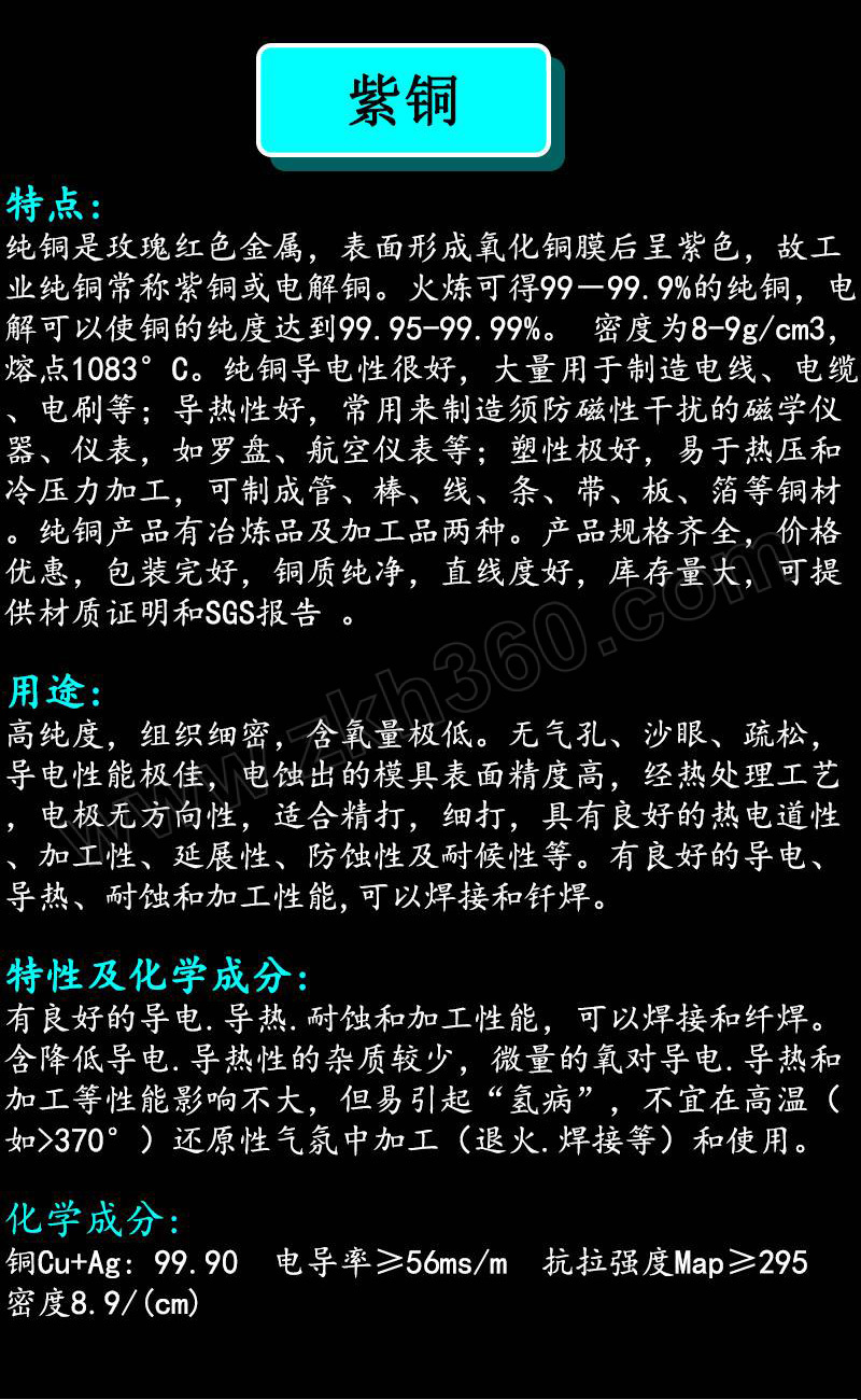 ·有良好的导电.导热.耐蚀和加工性能,可以焊接和纤焊。含降低导电.导热性的杂质少,微量的氧对导电.导热和加工等性能影响不大,但易引起"氢病”,不宜在高温还原性气氛中加工和使用