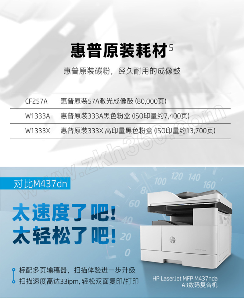 | 核心规格 | 三合一打印复印扫描 自动双面打印 有线/USB 适用耗材CF257A/W1333A/W1333X |
