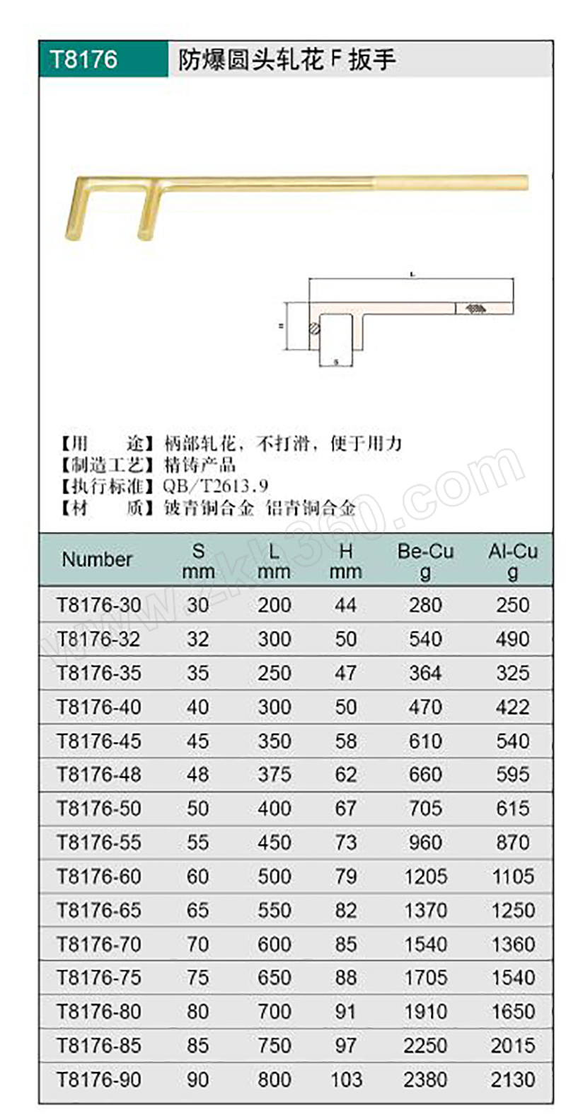 | 产品名称 | 176系列铝青铜防爆圆头轧花F形扳手 |