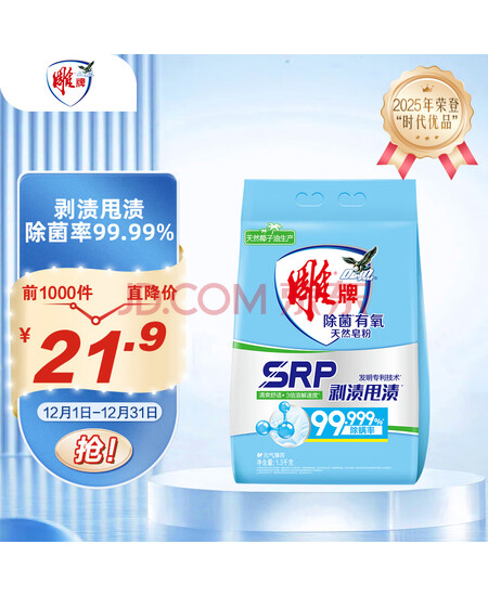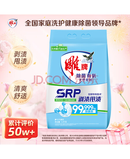 包装清单: 雕牌 除菌有氧 天然皂粉/洗衣粉 袋装1.3kg*1