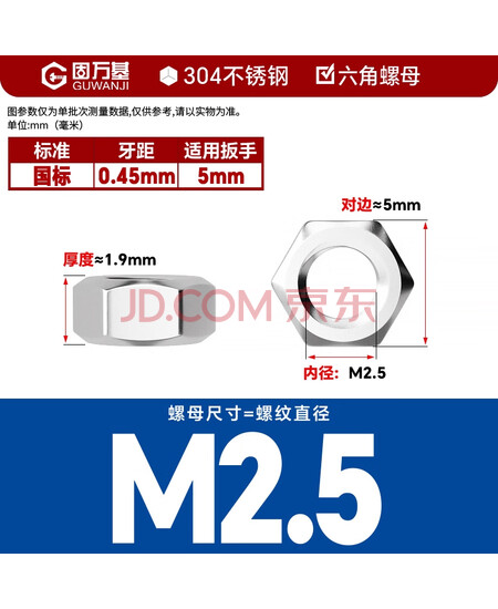 固万基(GUWANJI)六角螺母 不锈钢螺母六角螺帽螺丝帽 304六角螺母 M2.5[600个/包]