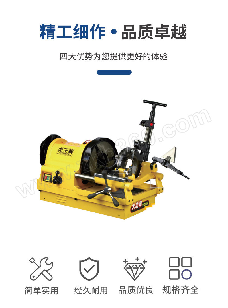 ·SQ100A-G型电动切管套丝机,加工范围广,配置高效的感应电机,斜块式退刀,自动控制螺纹长度。重负载齿轮箱设计,齿轮全钢化处理,结构可靠,机器效率高,噪音低,主开关隐于压铸铝机头下,防水并不易损坏。