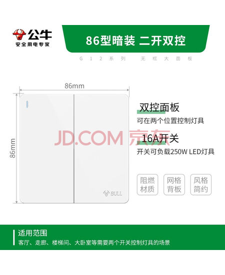 公牛(BULL)开关插座 G12系列 二开双控开关86型大面板开关G12K212 象牙白