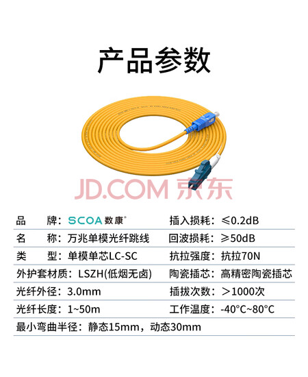 数康(SCOA)电信级光纤跳线LC-SC(UPC) 0.5米 单模单芯OS2小方头转大方头Φ3.0跳纤光纤线尾纤S-1LC-SC-S0.5