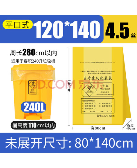 宏安途 医疗垃圾袋平口式医疗诊所专用全新PE料垃圾袋 平口式长80*宽40*高140cm4.5丝50只(240L桶)京配