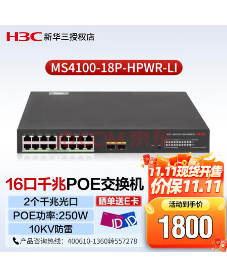 新华三(H3C)16口千兆交换机 轻管理安防以太网POE交换机主机 16千兆电口+2千兆光口 MS4100-18P-HPWR-LI