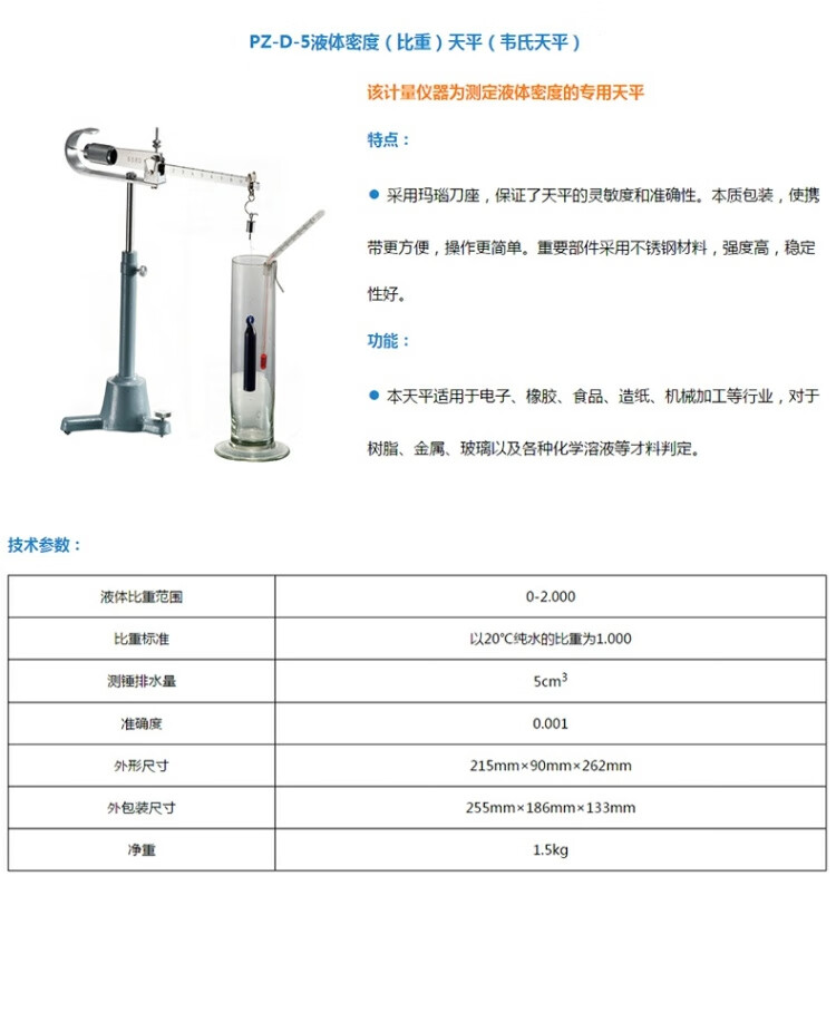 上海越平 PZ-D-5 实验室液体比重天平 韦氏比重天平秤密度计韦氏比重称天平 液体比重密度天平