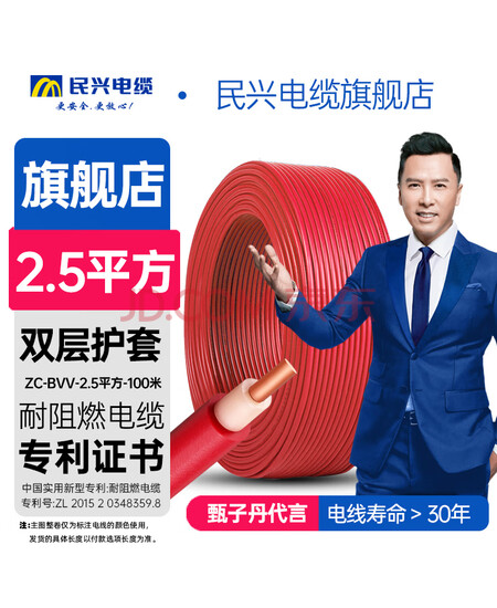 民兴电缆电线BVV国标铜芯阻燃电线空调照明插座ZC-BVV-2.5平方-100M 红色