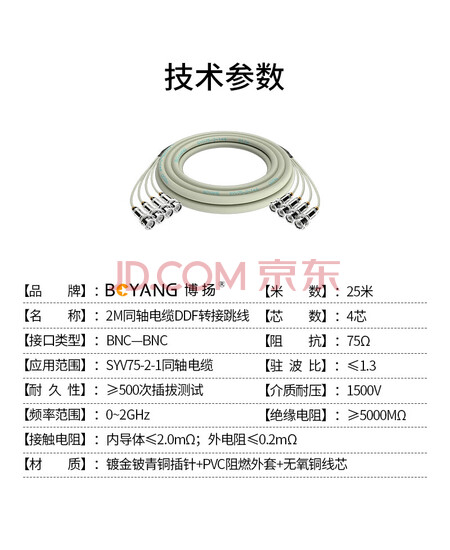 - 包装清单: 博扬 2M跳线BNC-BNC 2M兆E1接头成品跳线 syv-75-2-1同轴电缆DDF转接跳线 4芯 25米 BY-BNC/BNC-2-1*4-25m*1*合格证*1保修卡*1