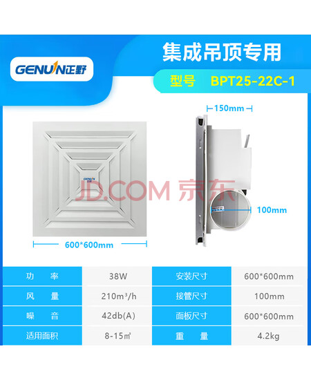 正野(GENUIN) 吊顶排气扇 BPT25-22C-1 600*600集成吊顶专用 通风换气商用大风量 吸顶管道扇排风 换气扇