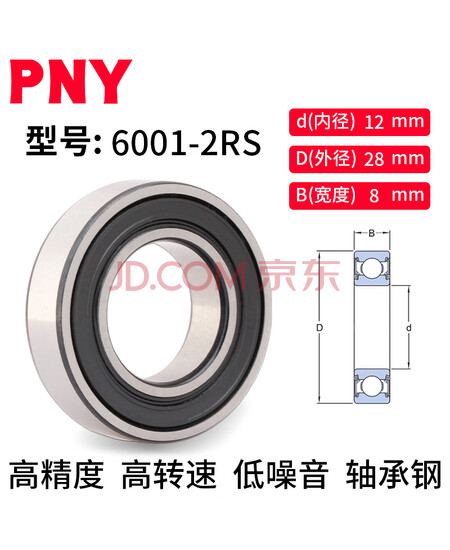 PNY深沟球6000系列铁盖ZZ胶盖2RS精密高速电机设备滚动滚珠旋转密封轴承 6001-2RS胶盖密封尺寸12*28*8 个 1