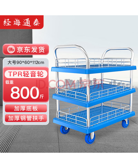 经海通泰 多层车三层双把手带围栏蓝色 载重800斤90*60*112cm 5寸TPR轻音轮 手推拉货搬运小拖车装修工厂