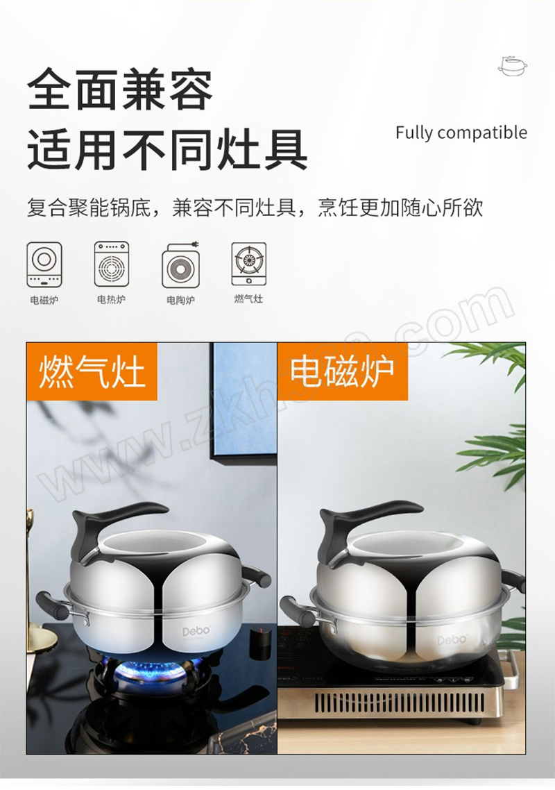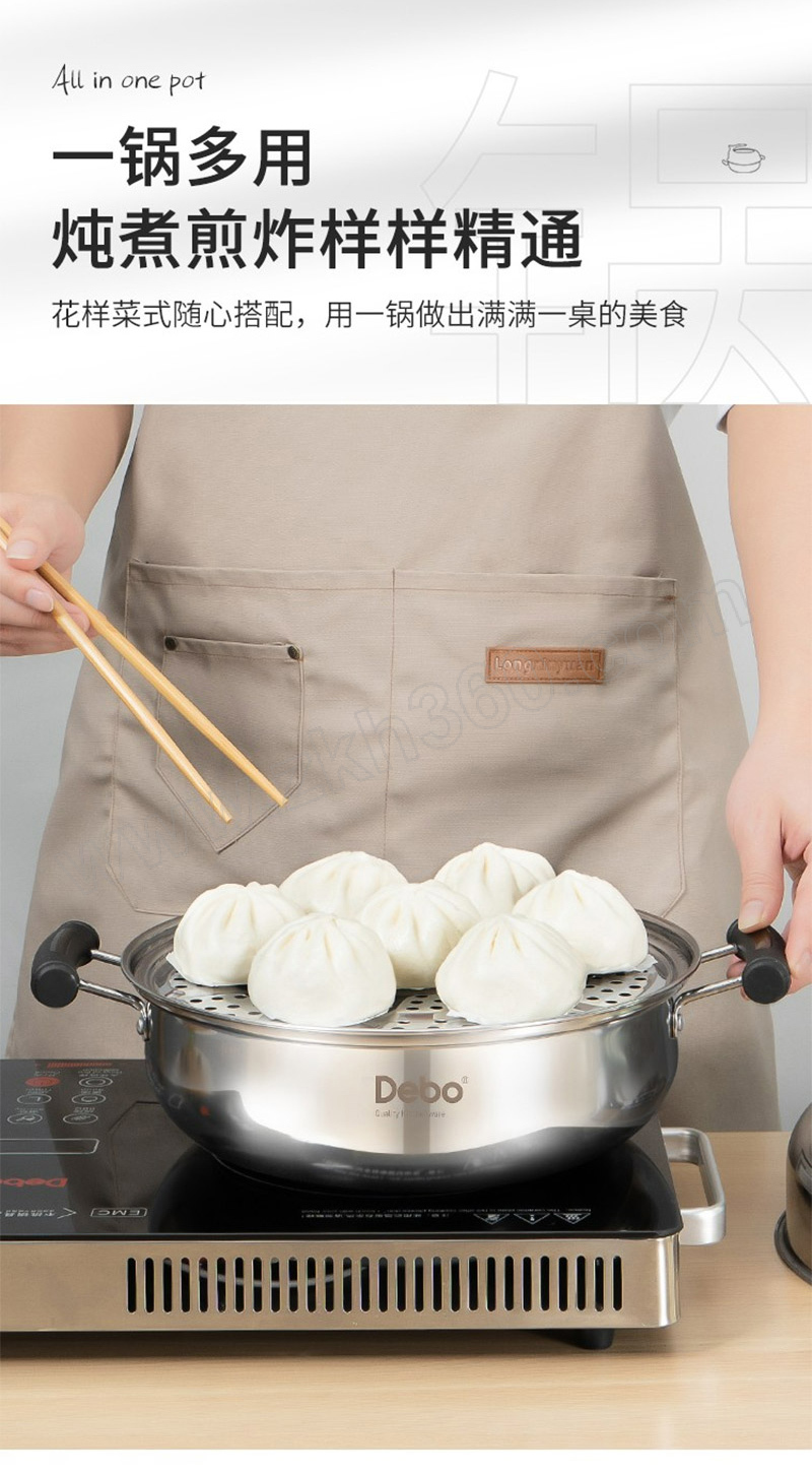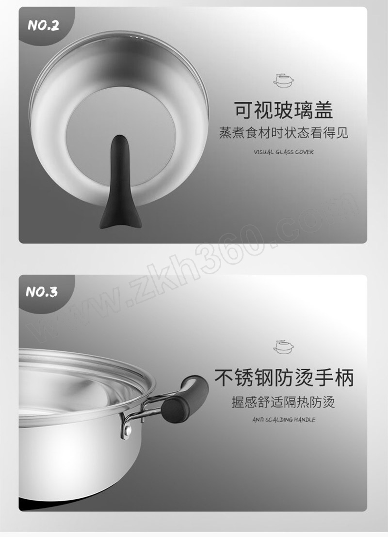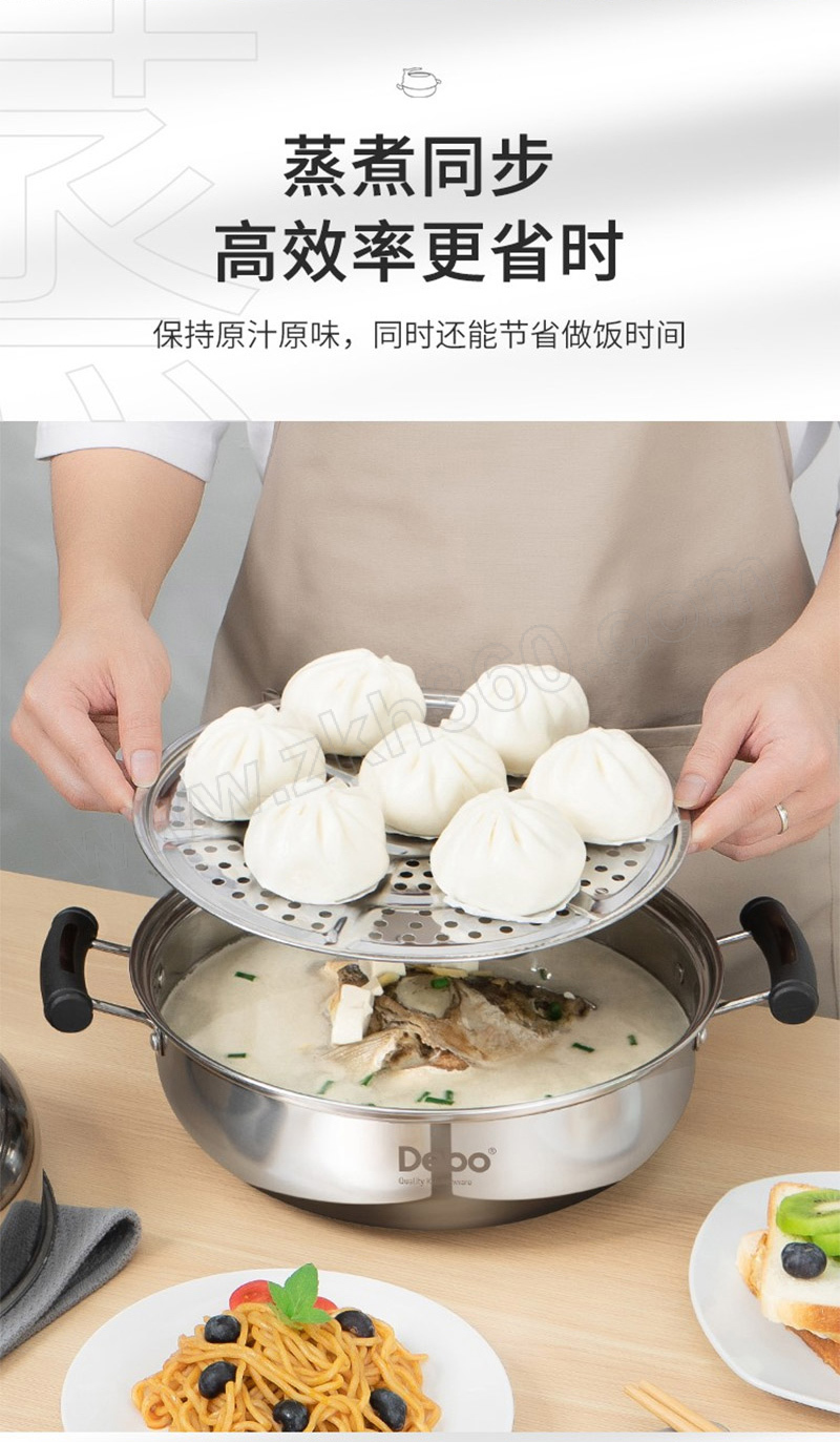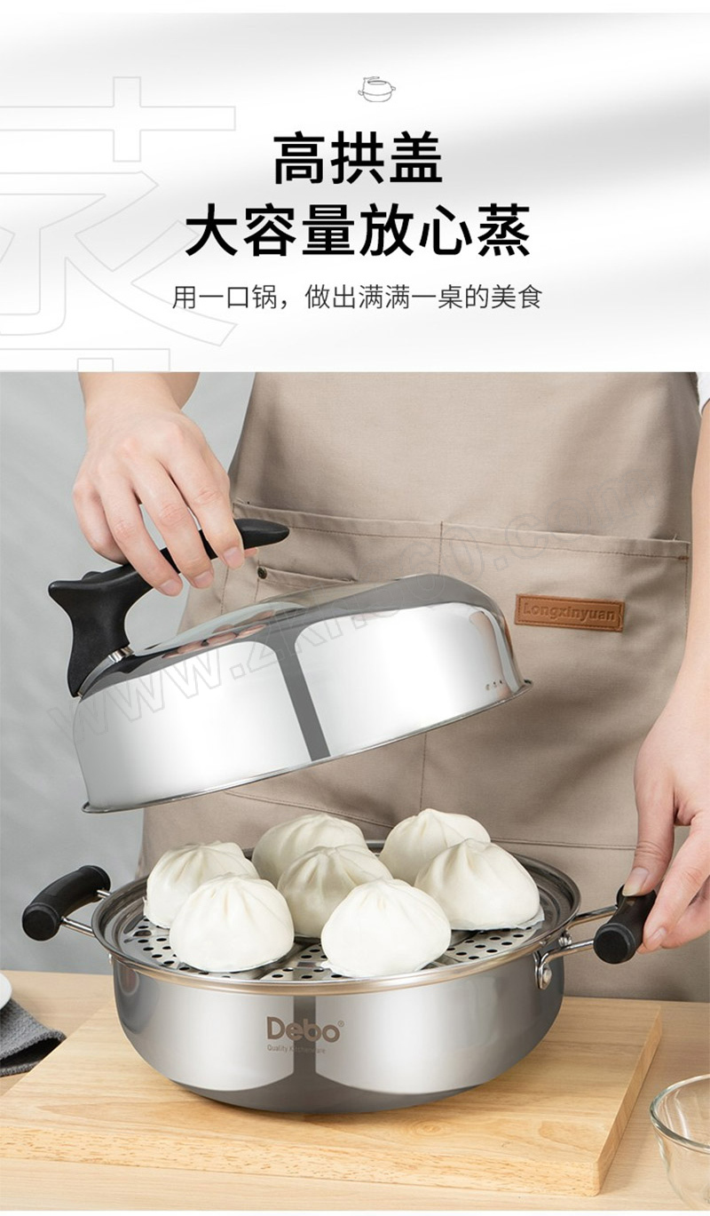 ·它是一组蒸锅、又是一口汤锅,也是一口火锅; ·高拱形锅盖让蒸的空间更大,不锈钢和玻璃的完美组合盖设计,烹饪进度随时可见; ·可立式防烫手柄,可以竖立摆放,节约空间,方便卫生,让您下厨得心应手。