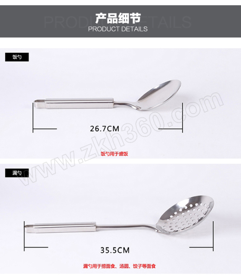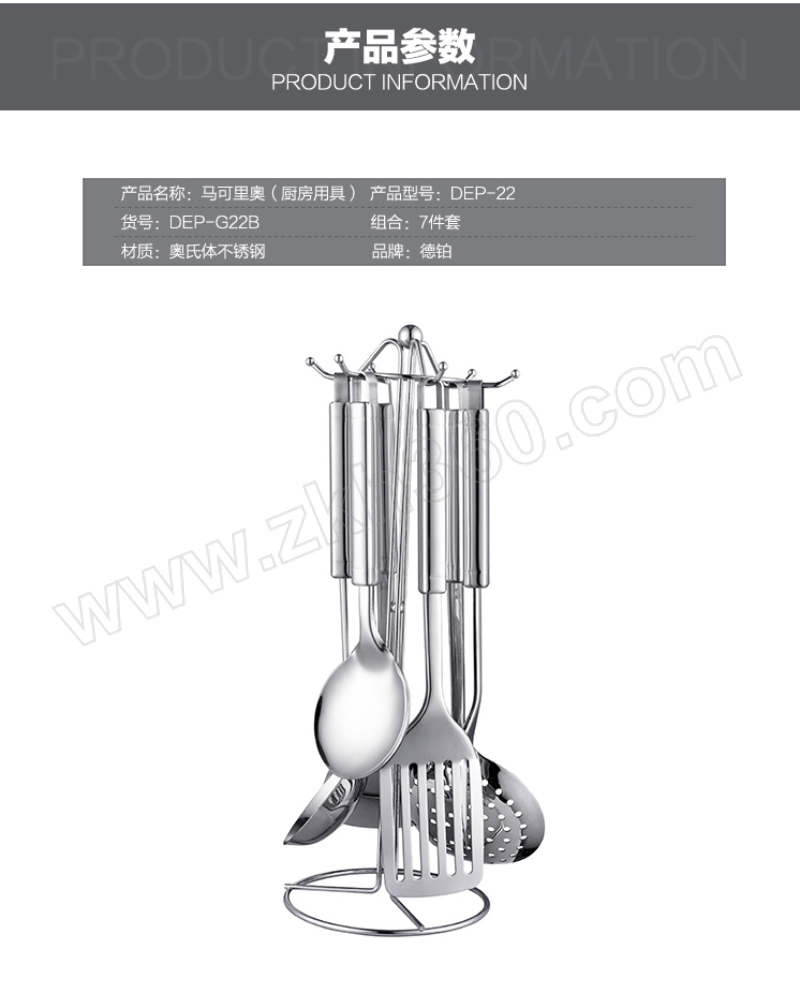 ·优质不锈钢材质,经精细抛光工艺处理,色泽灵动,易清洗,高档厨房的时尚选择; ·人性化防滑手柄设计、手感舒适、隔热防烫; ·圆型中轴架,挂取方便,安全稳固,经久耐用; ·汤勺、饭勺、漏勺、平铲、漏铲、肉叉全套组合,带来非厨艺全新体验乐趣。